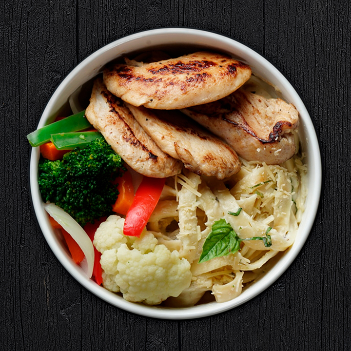 Fajitas de pollo salteado sobre una cama de fetuccini a la bechamel, acompañado de vegetales al vapor.