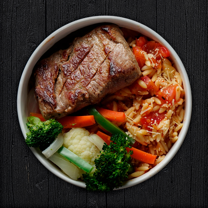Lomo de res selteado sobre una cama de fetuccini bañado en salsa napofiore, acompañado de vegetales salteados.